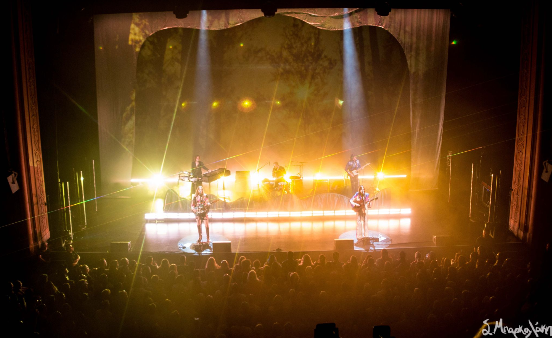 It was time for the main event and as the lights dimmed the three touring members stood in the back taking their spots. Then the two sisters appeared and came to the front where their two microphones were waiting for them. The background looked like a picture frame displaying vintage like videos through their set. They kicked off with eponymous, “Palomino,” “Angel,” and “It’s a Shame.”