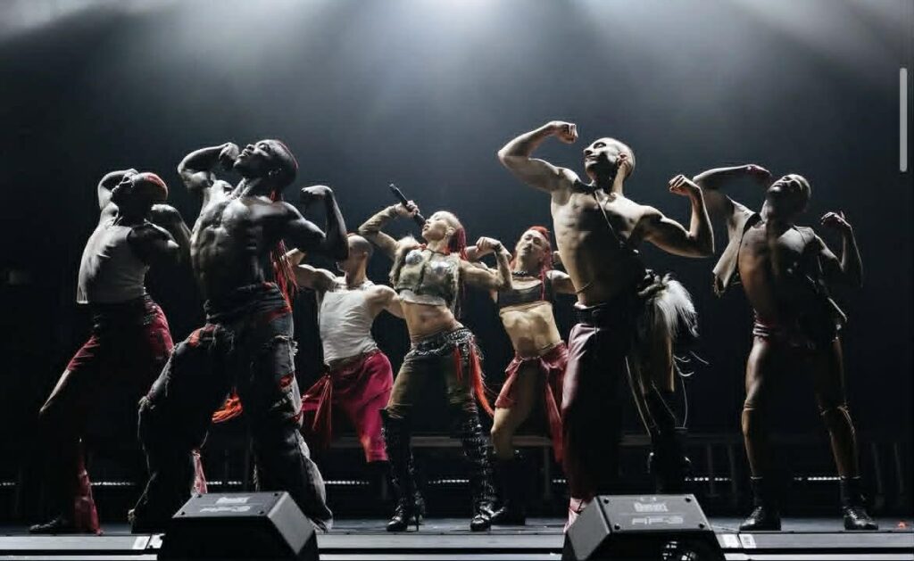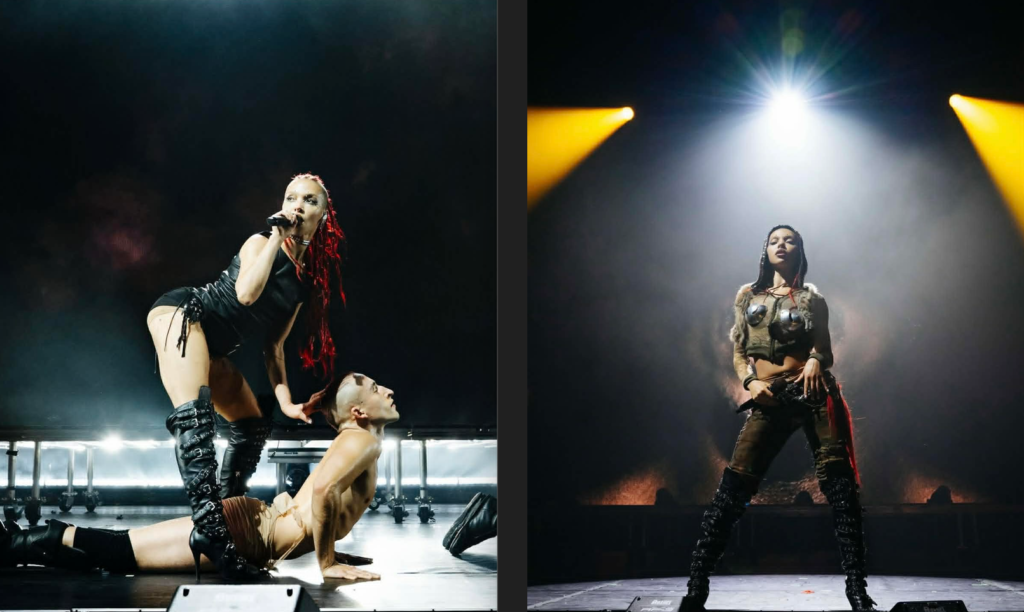 The stage design was deceptively simple at first glance: a massive screen at the back, the center of the stage kept mostly clear. But on each side stood towering metal structures equipped with poles, musicians, and dancers. At the height of the dance‑heavy numbers, the scene felt ripped from Mad Max industrial, feral, and beautifully chaotic. Their costumes matched the energy perfectly. It was art in motion, ever‑changing, ever‑evolving, and absolutely genius.