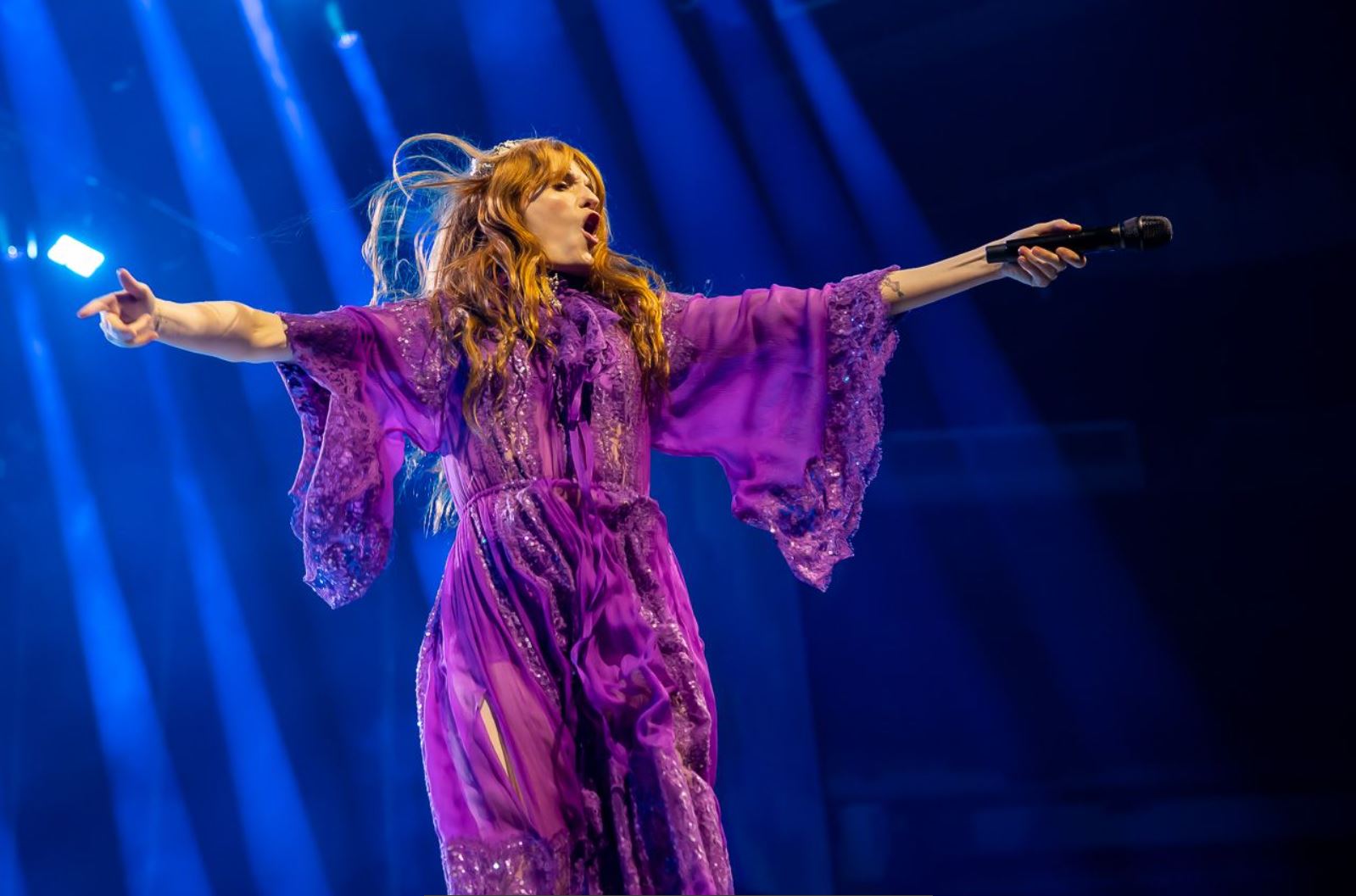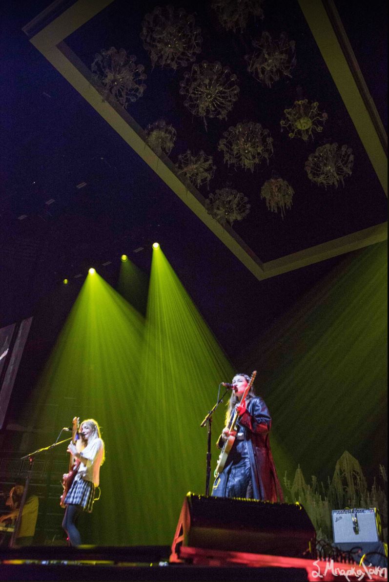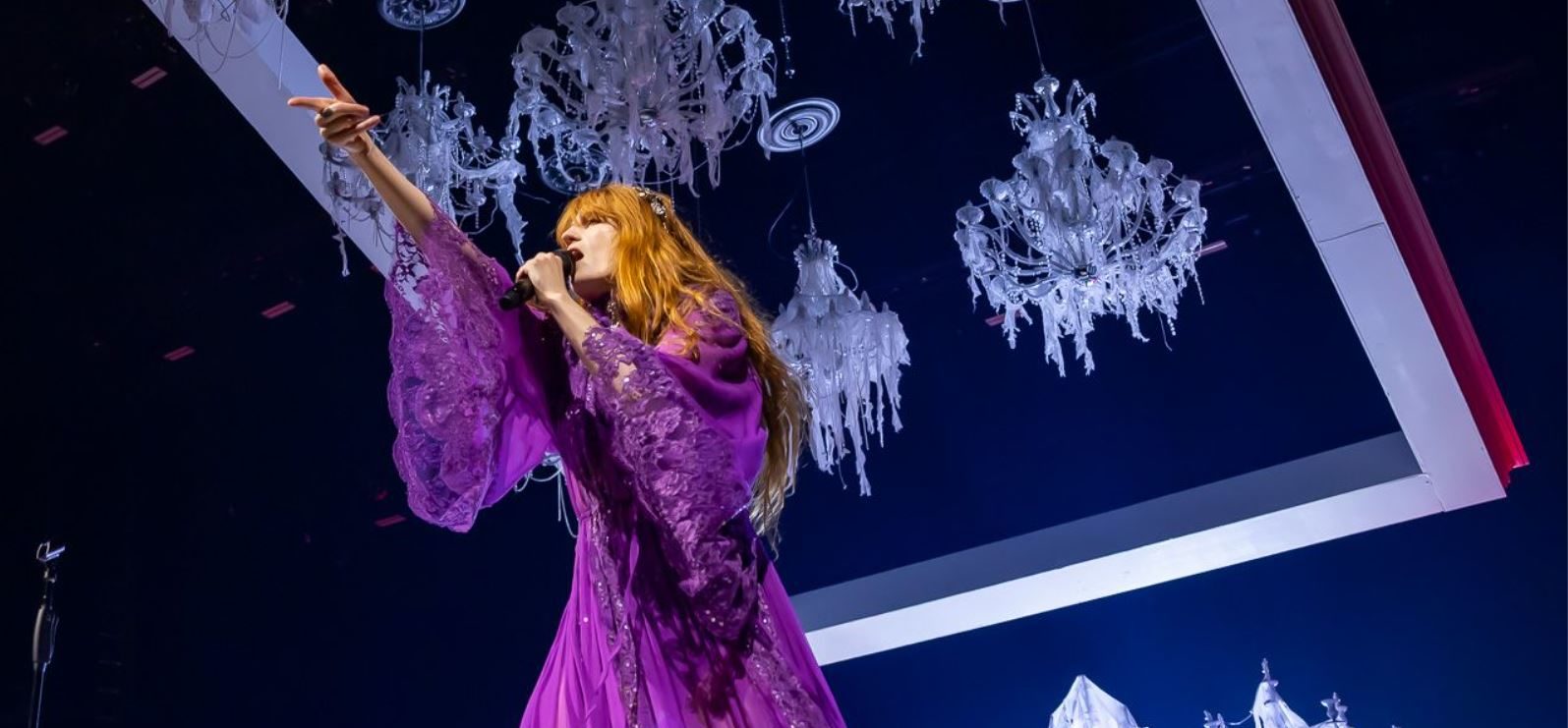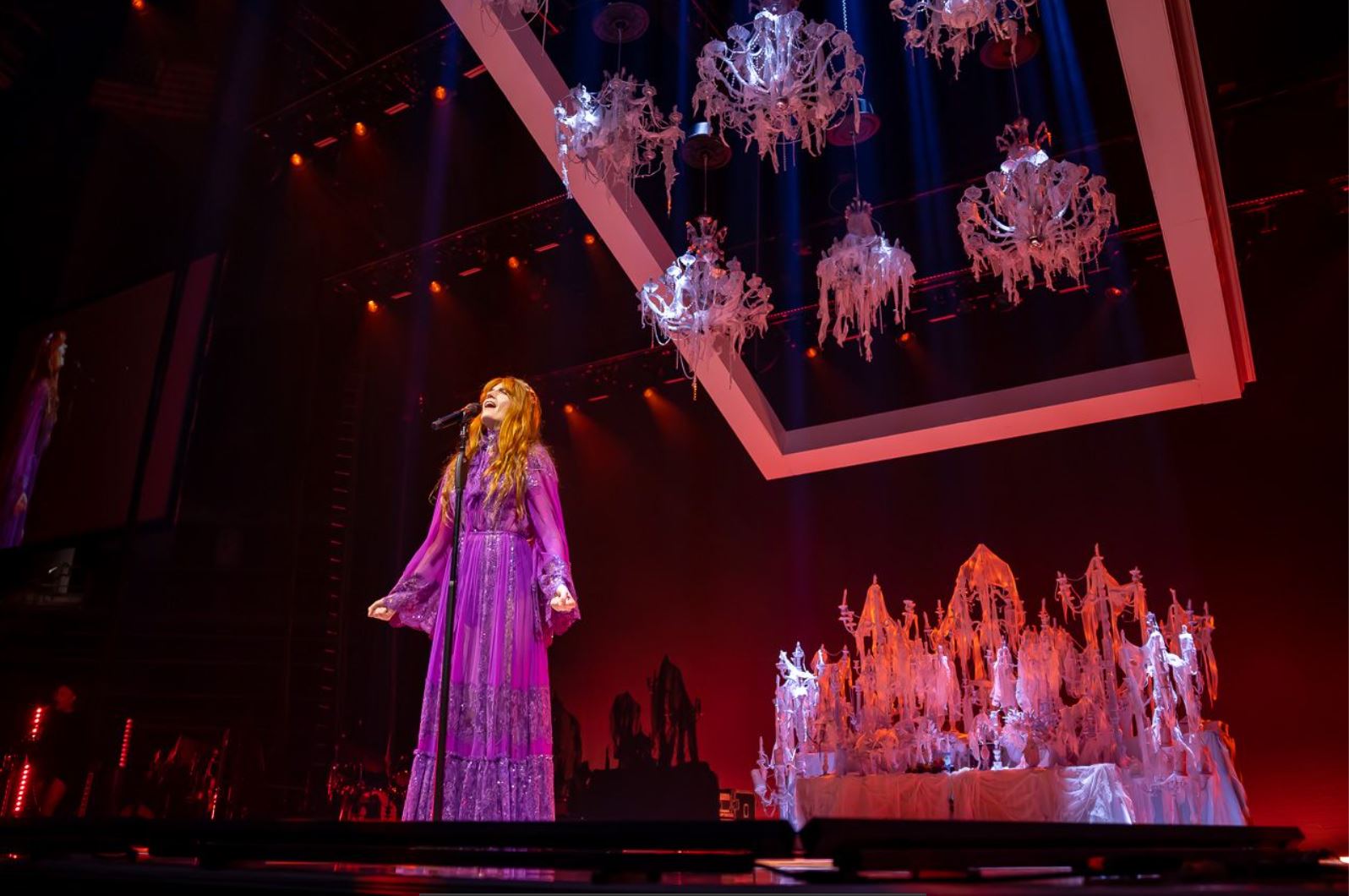After a quick set change the space went dark and Welch slowly appeared as a ghostly figure starting with “Heaven is Here.” A few chandeliers hung above her inside a movable white frame sometimes lighting up creating a very natural sense of light. Towards the back there were a few chandeliers placed over stairs, something that also resembled a fallen cathedral. The stage was divided in three pieces, the middle one where Welch spent most of her performance, and the two sides were for the band members.