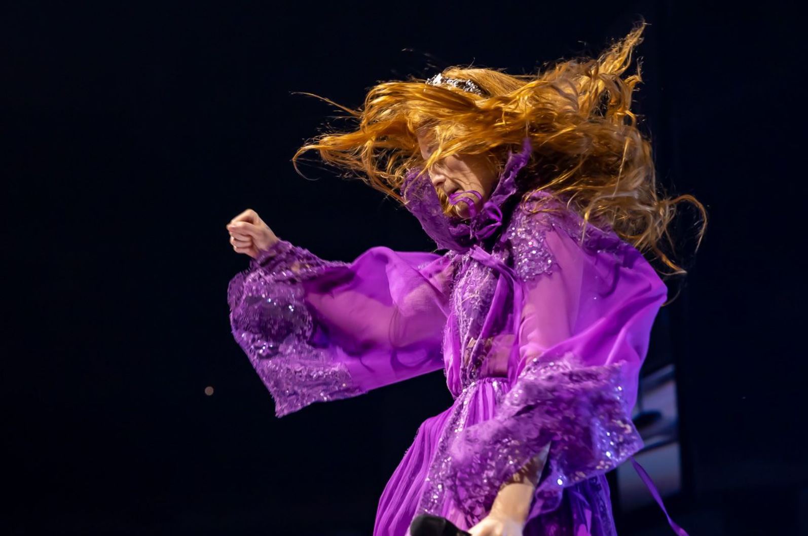 For one of my favorite songs, “Big God,” the middle of the stage resembled an art installation. Large black drapes came down and boxed Welsh inside as she danced around the space. In the back of the stage a spotlight lit, creating a large shadow in the front drape mirroring Florence‘s outline as she moved. As she stood closer to it her shadow grew larger emphasizing her emotions and at the climax of the song, she pounded her arm to the beat and fell hard on her knees hitting the bottom of the song’s abyss.