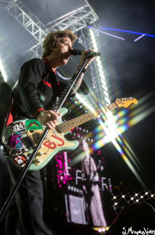 Billie Joe Armstrong was wearing all black with tones of red including his read socks and all black shell tops. When “Burnout,” started and we entered the Doukie album set, the background changed into the artwork originally designed by Richie Butcher. The distinct explosion and cloud were a part of the design as graphics displayed on the massive screens behind them. The clouds from the bombing were also a part of the lighting and they would change throughout the night.