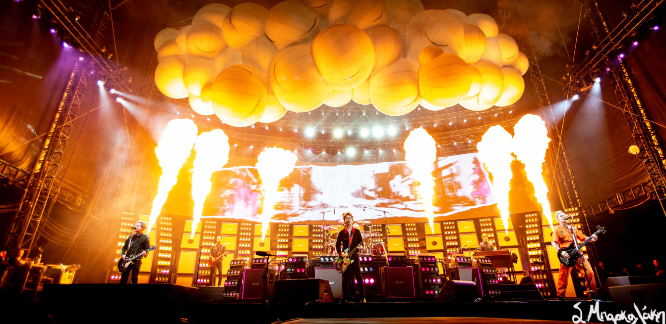 It was finally time for Green Day to take the floor and the stadium filled with loud voices when the band appeared, and lights began to flash along. They started with a new track from Saviors, “The American Dream Is Killing Me” as pyrotechnics paraded on the stage giving us a taste of what would ensue. Bassist and backing vocalist Mike Dirnt played on wearing an orange jumpsuit as Tré Cool brought high energy behind the drums with his blue hair and mascara.