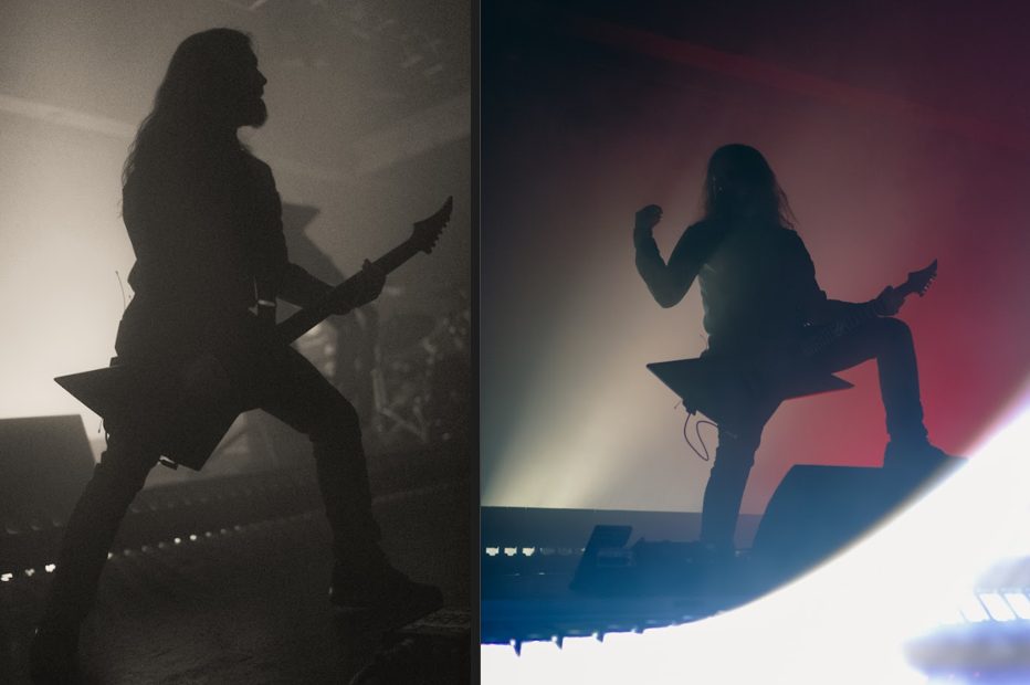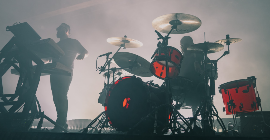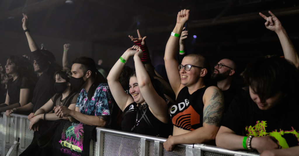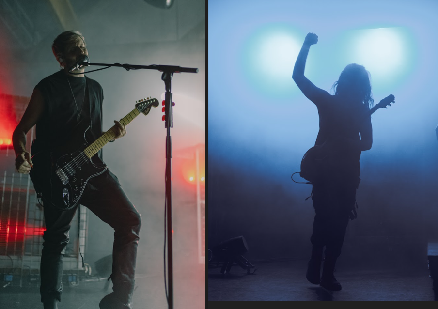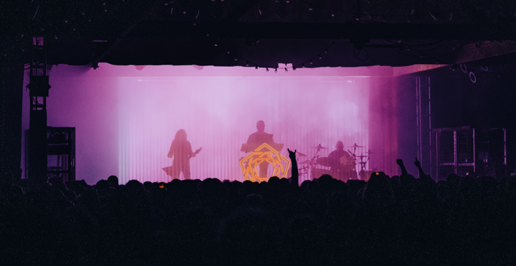 After a necessary break from the madness, HEALTH took the stage. This band’s darkwave style industrial metal music mixed with their cave-like backdrop on stage made me feel like I was in the underground dance scene of The Matrix Reloaded. This quick US leg of the tour, titled CONFLICT:LEATHER, kicked off in San Francisco on March 31st, and closes out on May 5th in Austin, Texas. With their music featured on other games like Grand Theft Auto V and Max Payne 3, another nod to video games for the evening included Health’s bassist, John Famiglietti, rocking an Elden Ring shirt. As the show continued, at one point the lead singer, Jake Duzsik, asked the audience, “What’s the difference between a Maserati and an erection… I don’t have an erection.” This really set the mood for the rest of the show as they continued their hardcore riffs and epic drumming from their drummer B.J. Miller for the rest of the night.