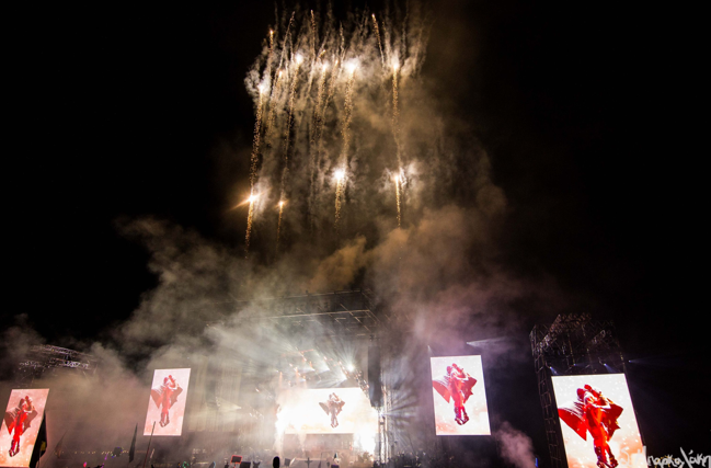 After the legend was done it was time for the rising star to take the stage to finish night one. It was the first time we would get to see Illenium‘s new show production for his live sets this season. The event included a couple large monitors on each side of the stage and endless amounts of pyrotechnics. Including the background display there were five screens going off at the same time making the visual part of the show intriguing and engaging. Nicholas Miller was standing at the top part of stairs with his tables and his live band members were on the stage floor a few feet down.