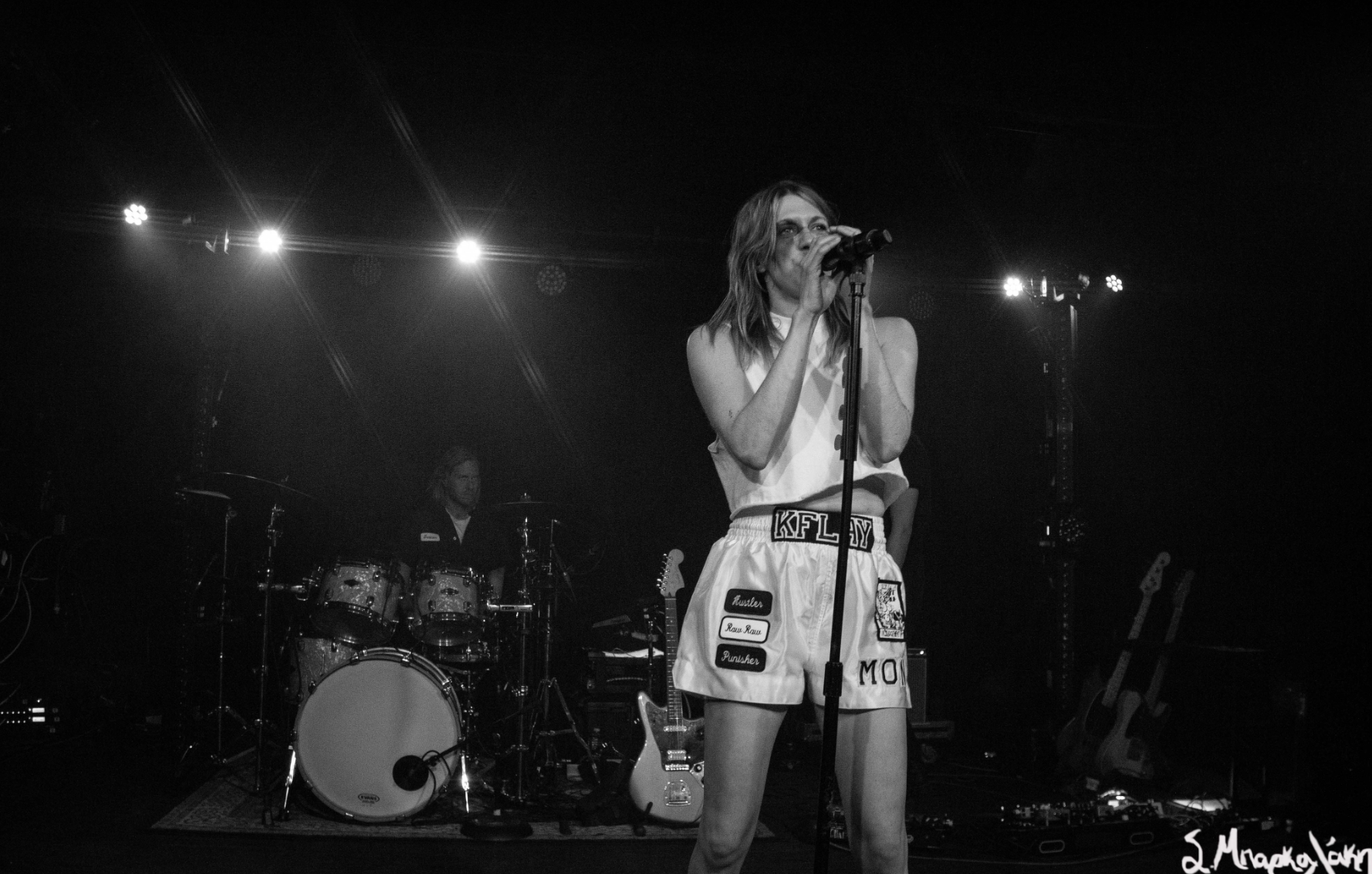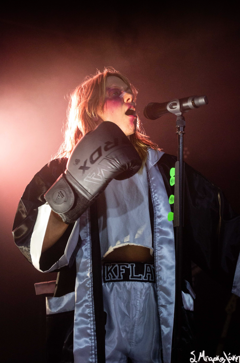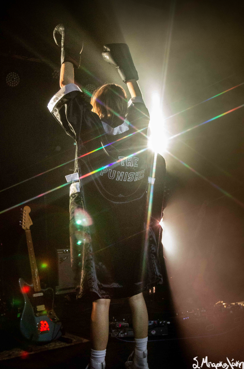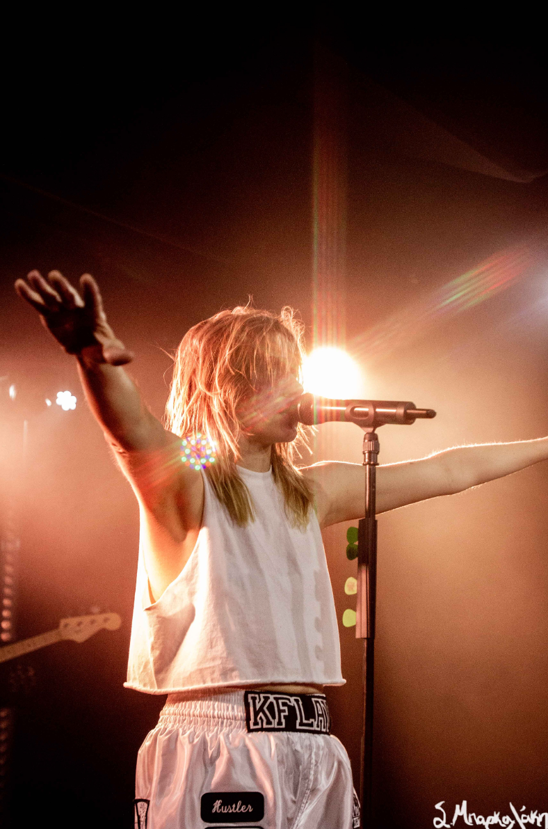 After a good opening set by Cam Kahin to a packed room it was time for K.Flay to take the stage. First her two touring members took their places and she followed dressed up in a boxer outfit which has been theme of the show. Wearing boxing shoes, boxing gloves, a boxing robe with the words The Punisher on the back, shorts that amplified Mono, and makeup of a bruised eye and broken nose, she was ready to defeat any obstacles that stood in her way.