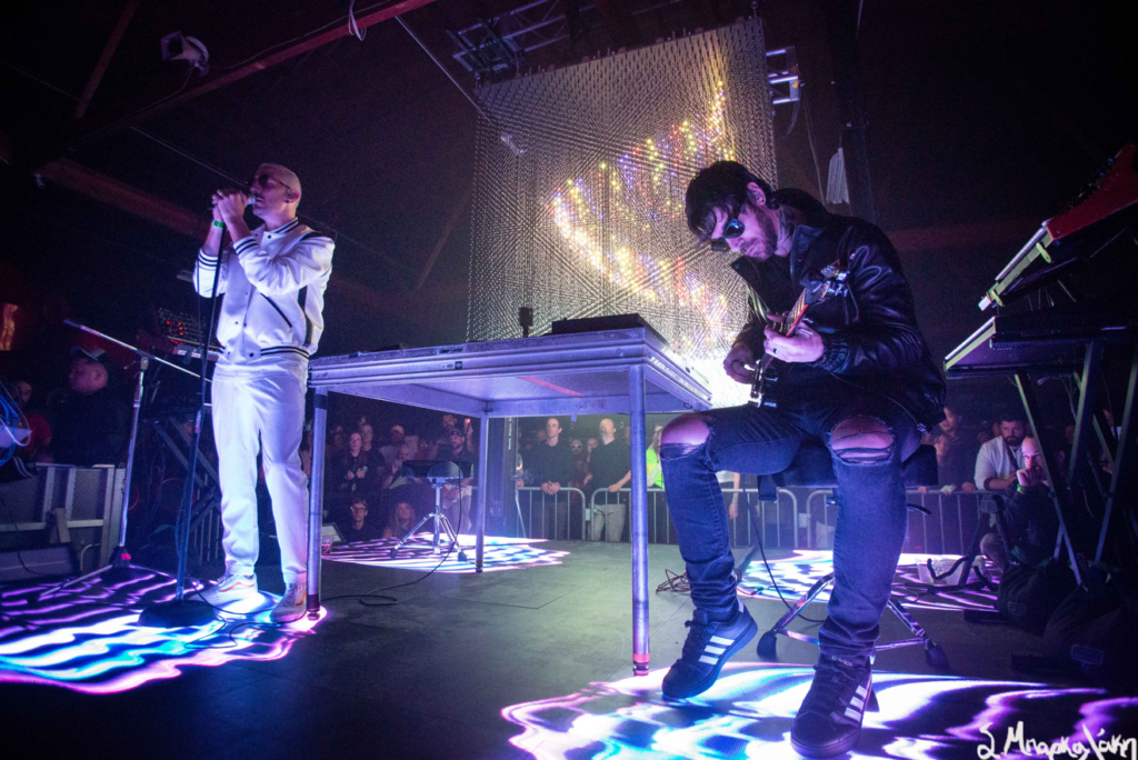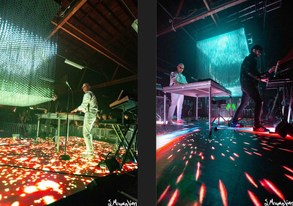 A little after midnight, Kasablanca stepped onto their custom‑built stage in their signature black‑and‑white outfits, the duo’s visual calling card. Viktor Kasablanca in black, the analog architect, took his place behind the modular rigs and sequencers, while Micky Kasablanca in white, the melodic lead, moved between keys, controllers, and vocal processing. No one looked cooler walking onto a stage. Their setup sat towards the back in the center: a glowing floor screen beneath their feet and a towering cube above them, both pulsing with visuals that responded in perfect sync to the music.