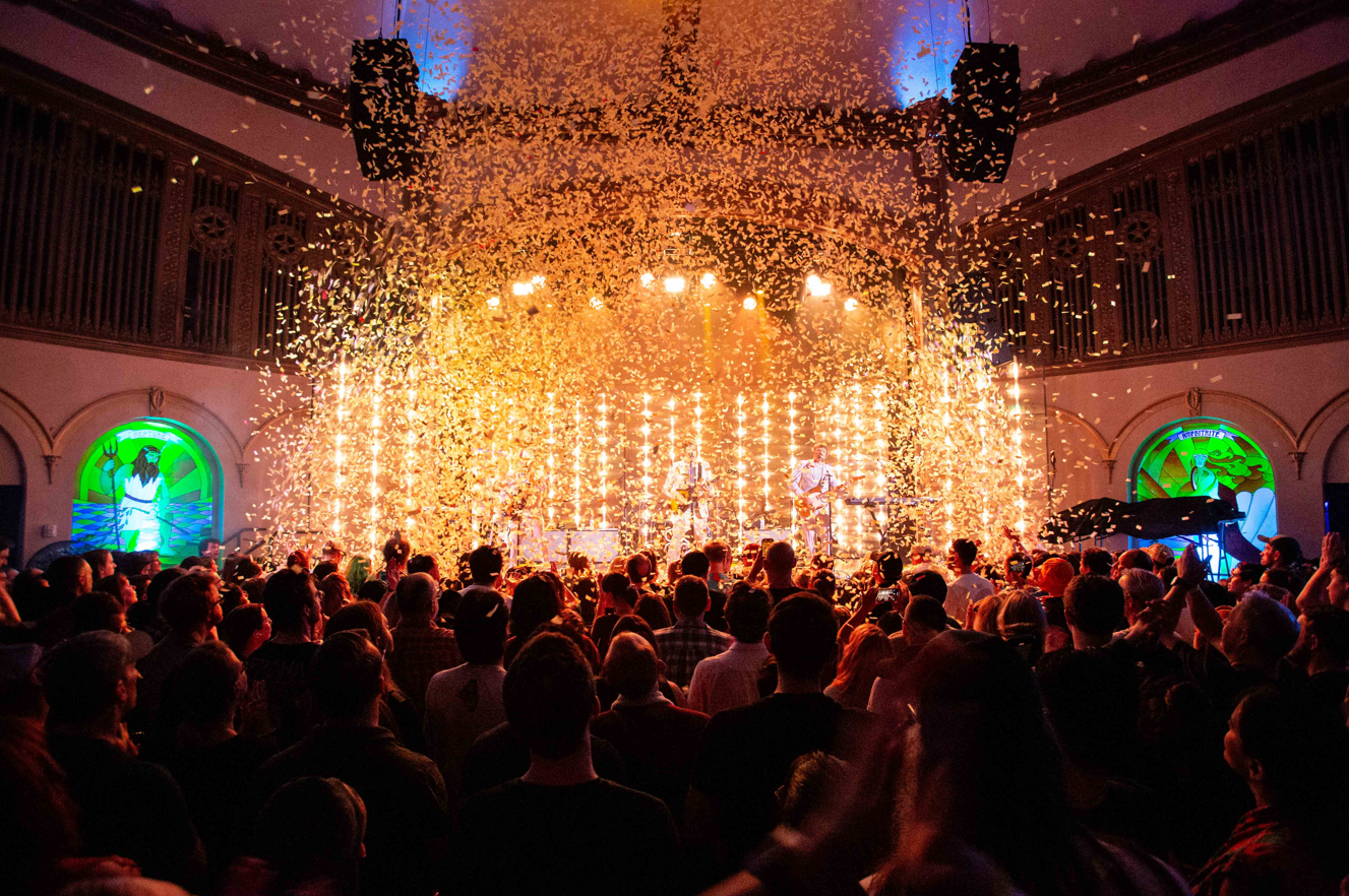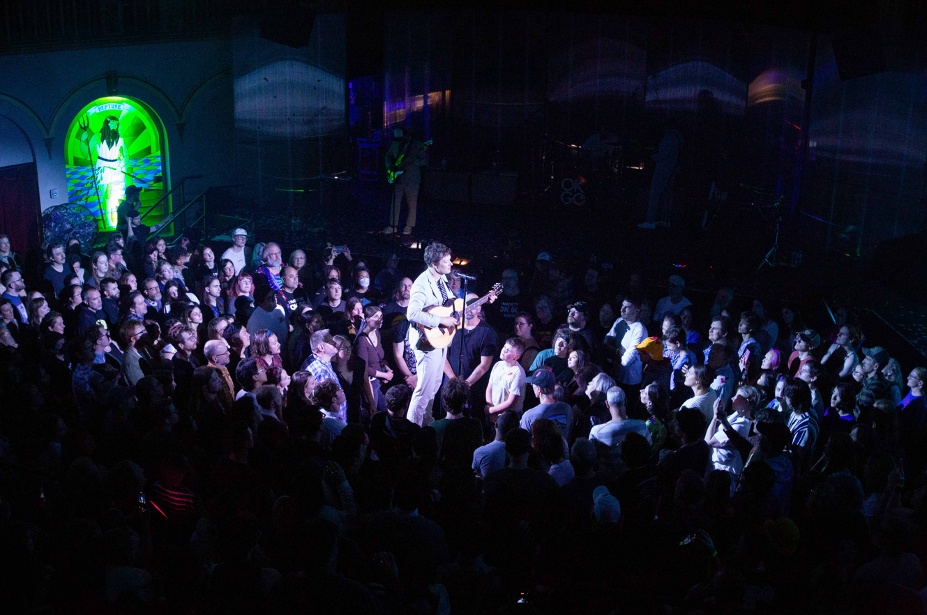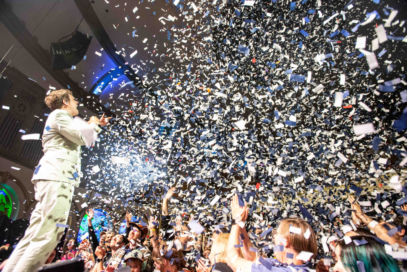 A little after nine the band took the stage and was in full force starting the night with “Impulse Purchase,” “This Too Shall Pass,” and “Get Over It.” Kulash‘s contagious energy filled the room and set the mood for the rest of the show. Before the first song was even over, he was already jumping into the pit to join the crowd. He sang in the middle of the floor as the people circled around him and the confetti flew high in the air. We did notice many kids in attendance, and they absolutely loved being there. Kulash mentioned that they had cameras around the venue and that they were streaming live to children’s hospitals. He would stop and dedicate songs to specific kids watching live which was so nice to see.