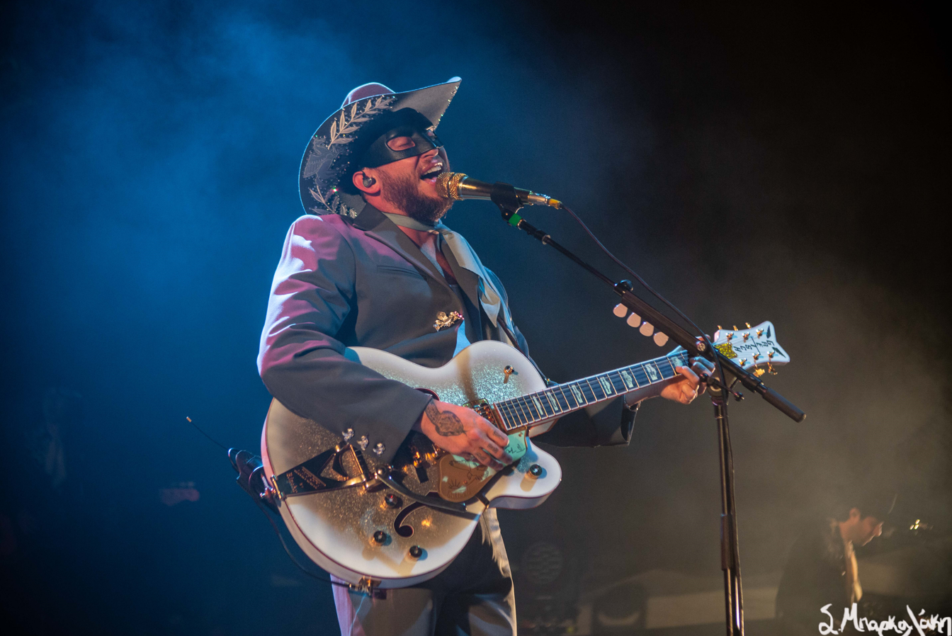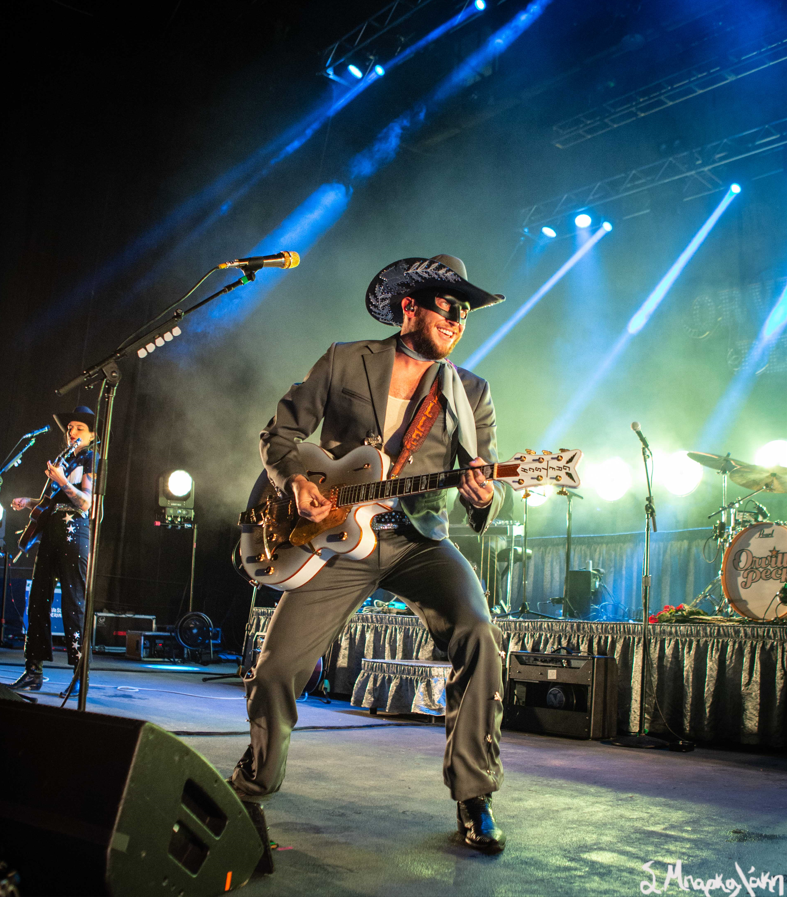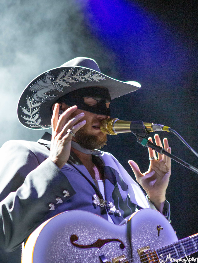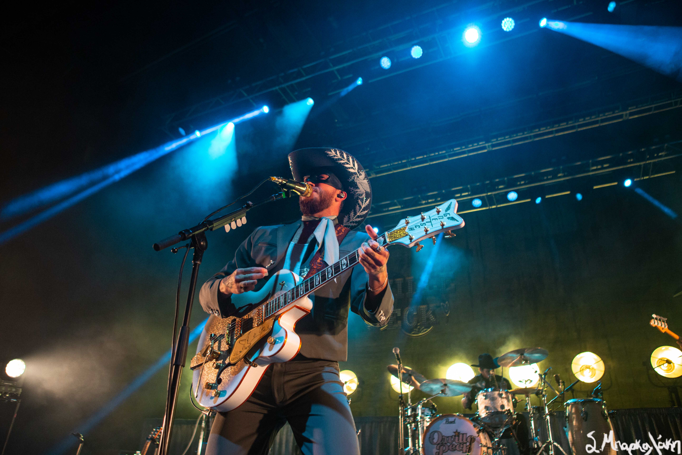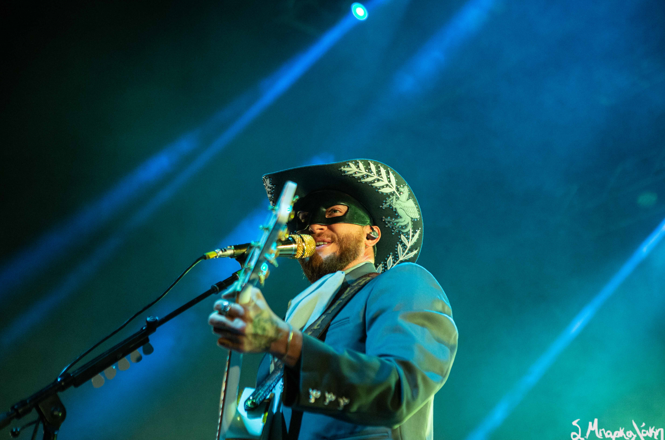 The five-piece band took the floor wearing all black and cowboy hats matching each other as Peck stood out wearing an all-blue suit and cowboy hat with his black mask. The show started with “Big Sky,” and “Turn to Hate,” and as the rain continued but that didn’t stop Peck taking his jacket off leaving his muscular arms visible in his white tank top. I’m pretty sure someone yelled, “Yes, daddy” to this.