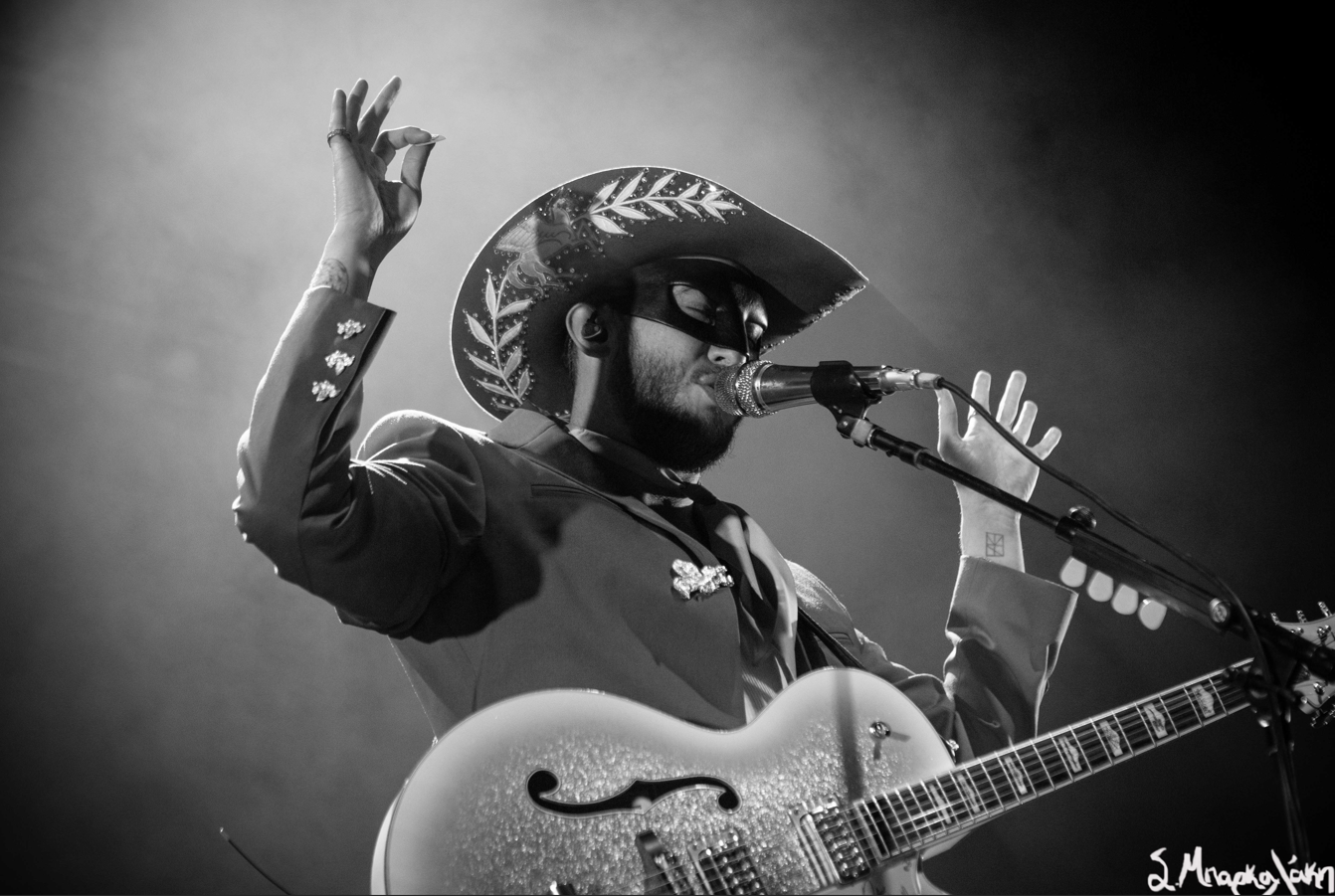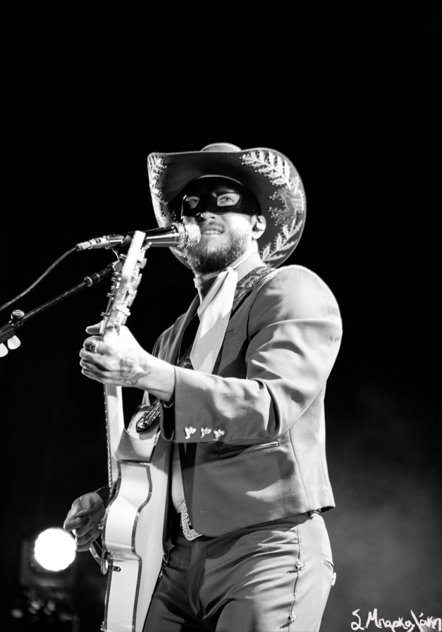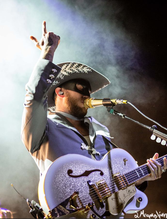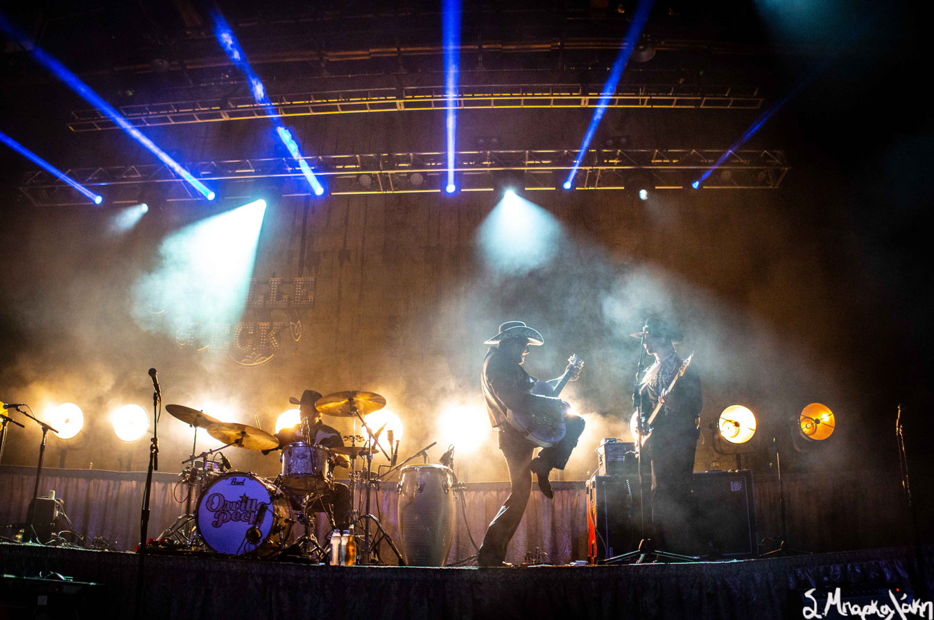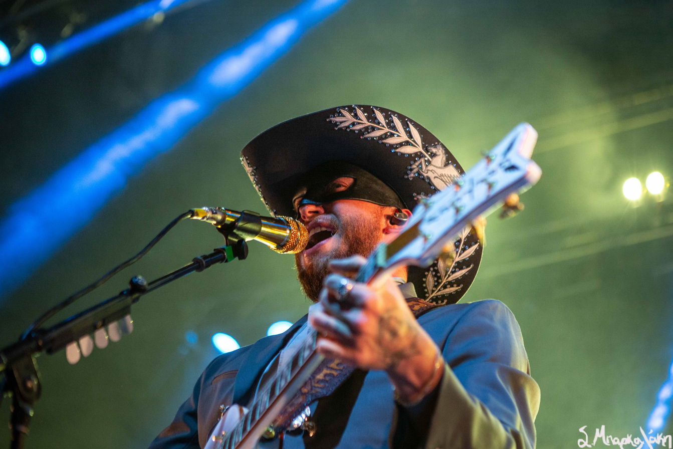 The five-piece band took the floor wearing all black and cowboy hats matching each other as Peck stood out wearing an all-blue suit and cowboy hat with his black mask. The show started with “Big Sky,” and “Turn to Hate,” and as the rain continued but that didn’t stop Peck taking his jacket off leaving his muscular arms visible in his white tank top. I’m pretty sure someone yelled, “Yes, daddy” to this.