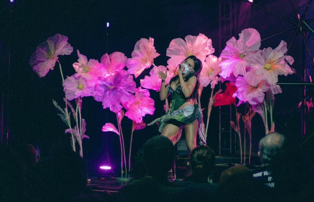 Having released music as early as 2022, some of her songs have even been co-produced by Corin Roddick of Purity Ring. This is apparent as her similarly electronic-dreampop style shines when she takes the stage and starts dancing in front of the colorful giant flowers on the compact side of the stage set up for her. While she wasn’t wearing any wings, Yuni felt like the main fairy of this beautiful backdrop. This image was slightly shattered when she mentioned that she felt like she was going to “sh*t her pants” from being so nervous. Based on Yuni’s impressive dance moves that accompanied her consistently fun vocals, you would have never guessed. One of the last songs she played was titled “Butter Chicken Lover,” which I think we can all agree to identify with. If you’re already a Purity Ring fan, it’s not a far stretch that you’d enjoy Yuni’s full discography.