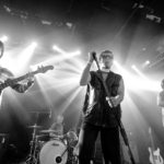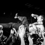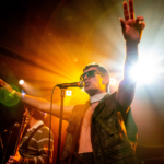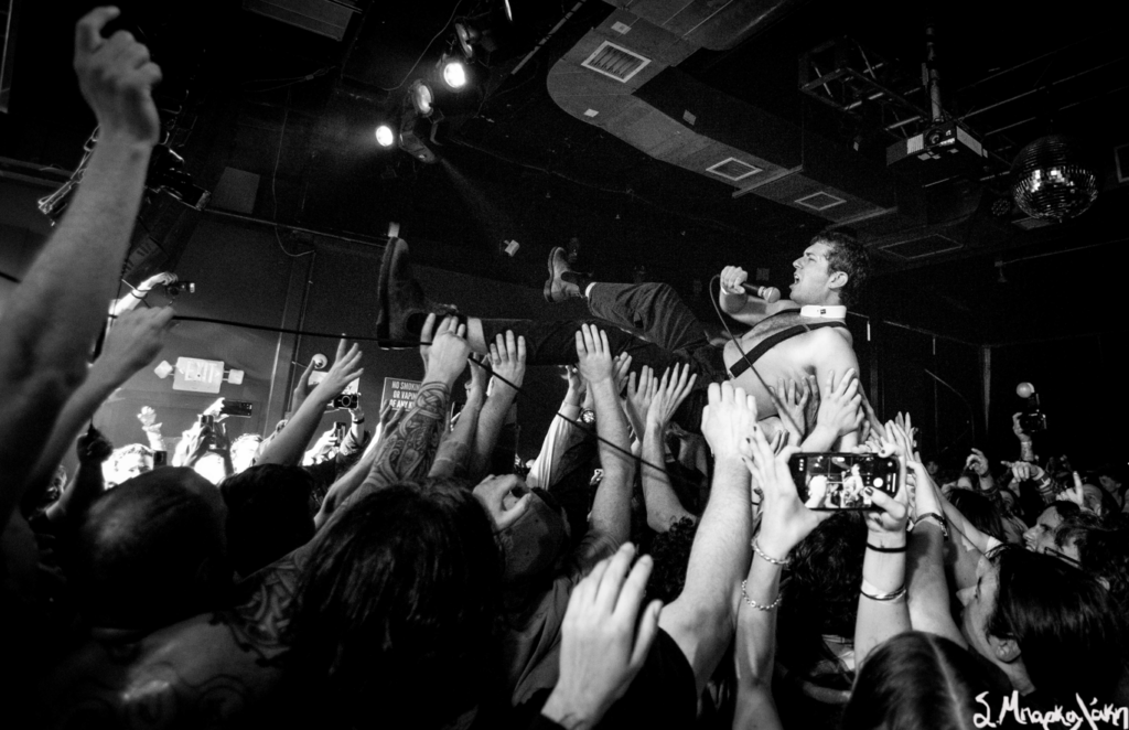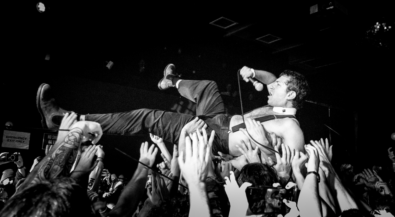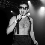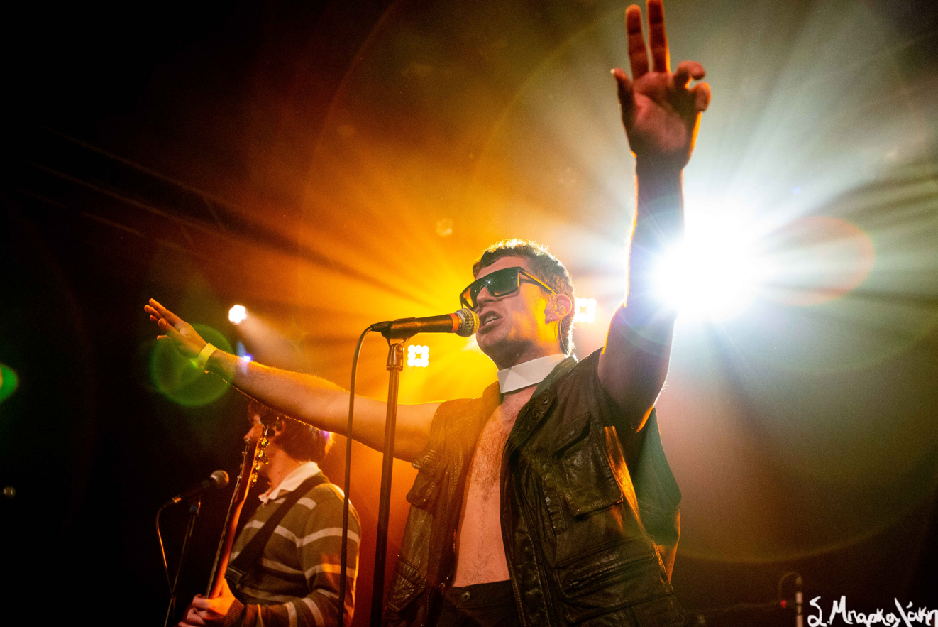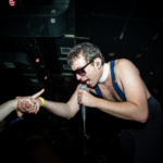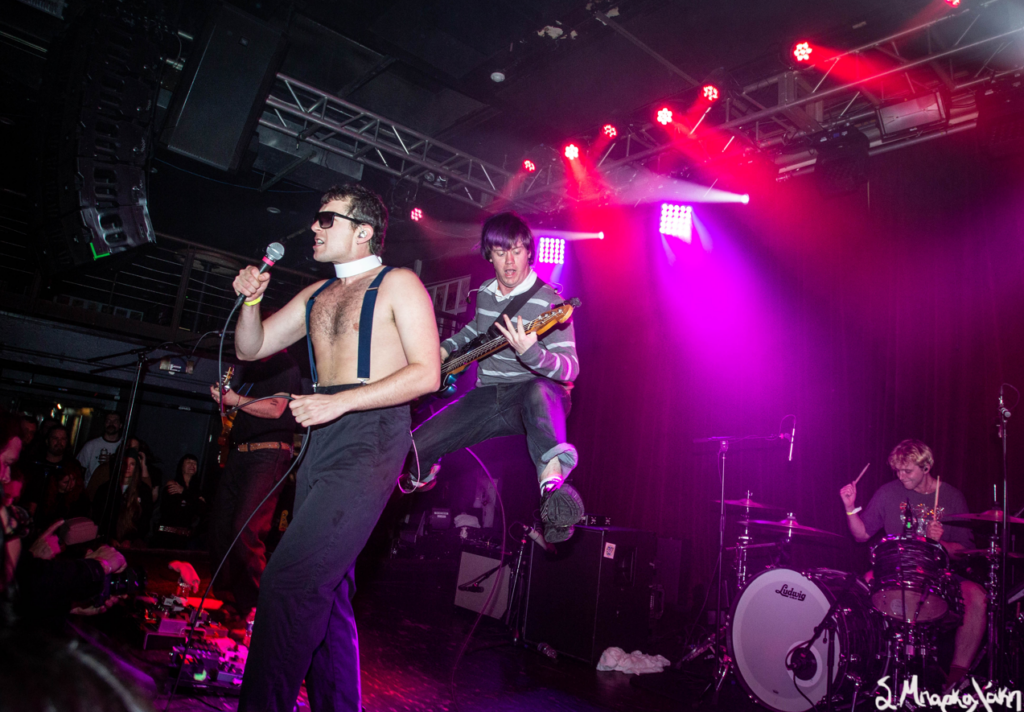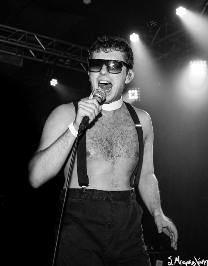 Frontman Charlie Steen poses for the pictures we want; he knows how to work the cameras perspective. Shirtless in a priest’s collar, member of the clergy symbolism, he’s a showman giving a sermon. He uses his microphone stand to conduct us along. Slinging it behind his neck, his arms hung over the top, like he’s hostage in a guillotine. Sunglasses, suspenders, giving head honcho, crowd controller, conductor, he acts and we follow suit. He’s more understated than he has been but still not lacking energy by any means. He enunciates words with sergeant like vigor and delivers them with conviction that dares me to believe this could go doubly well on a rap beat.