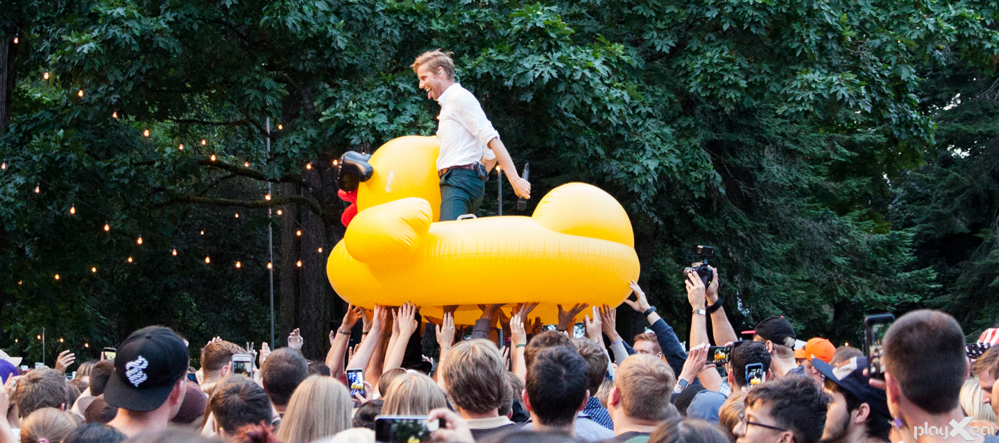 The second to last act of the night was Andrew McMahon in the Wilderness, fronted by Andrew McMahon who gained recognition through his bands Something Corporate and Jack’s Mannequin. He sat in front of the stage along with his full length piano, singing but very much turning and engaging with the crowd. We were in for a surprise as various objects started to appear during his set, including beach balls, blowup air blown inflatables and our favorite, a huge rubber duck that he crowd surfed in. You couldn’t help but smile during most of his set and that is a great charisma. His second album Zombies on Broadway was led by “Fire Escape,” and we really like the collaboration with Atlas Genius’ Keith Jeffery, “Brooklyn, You’re Killing Me.”