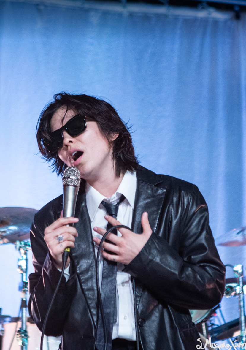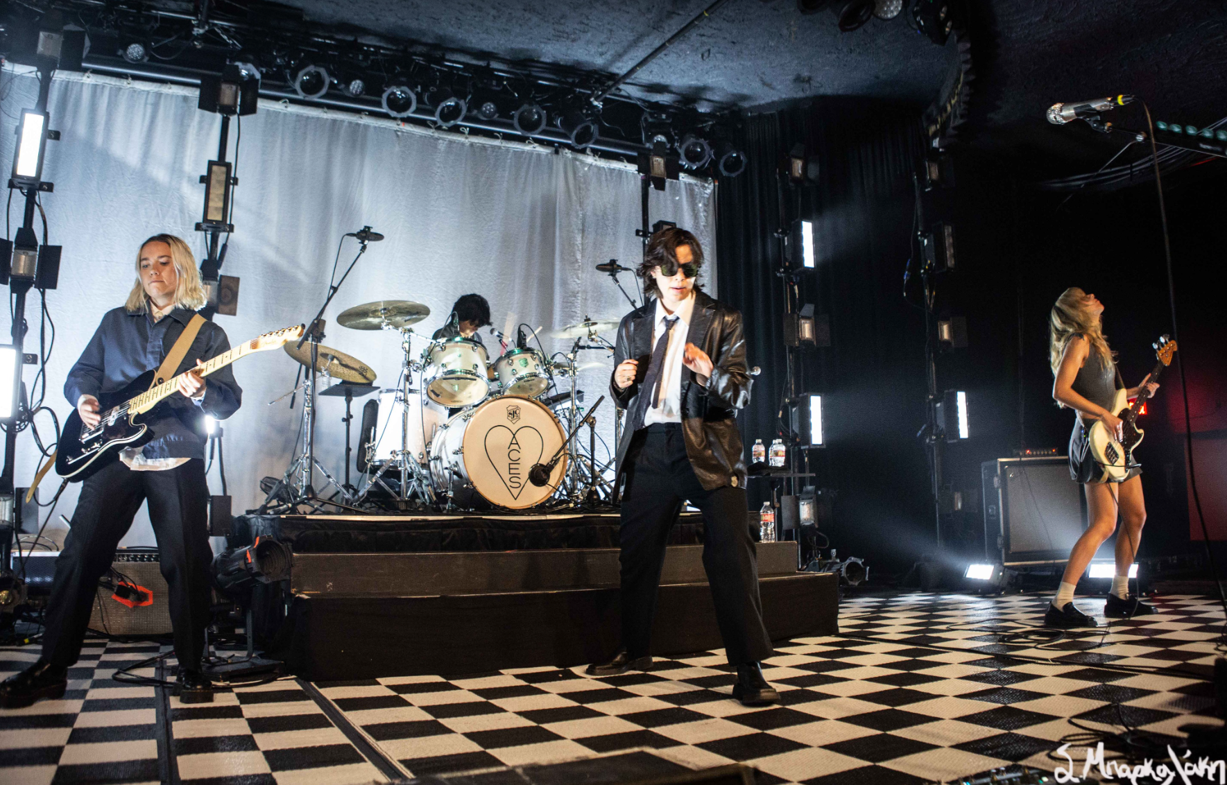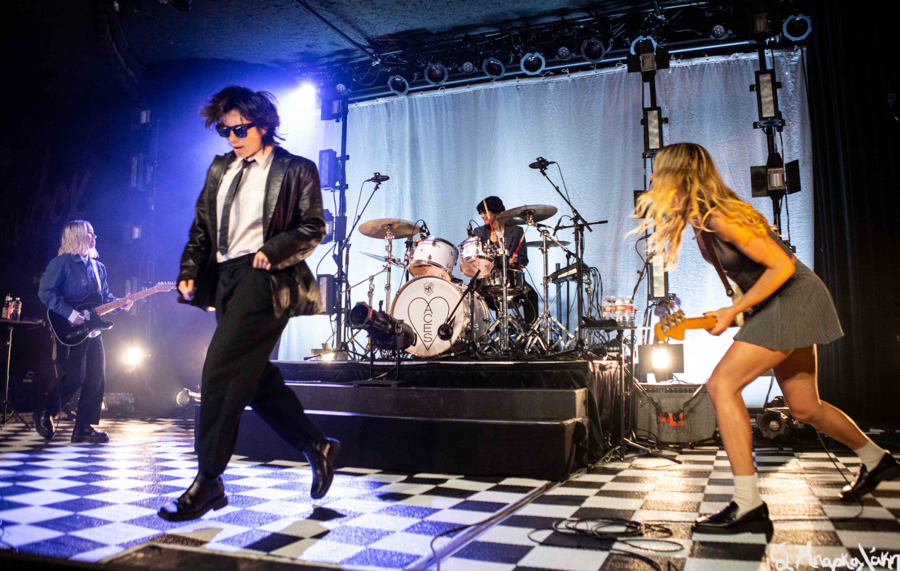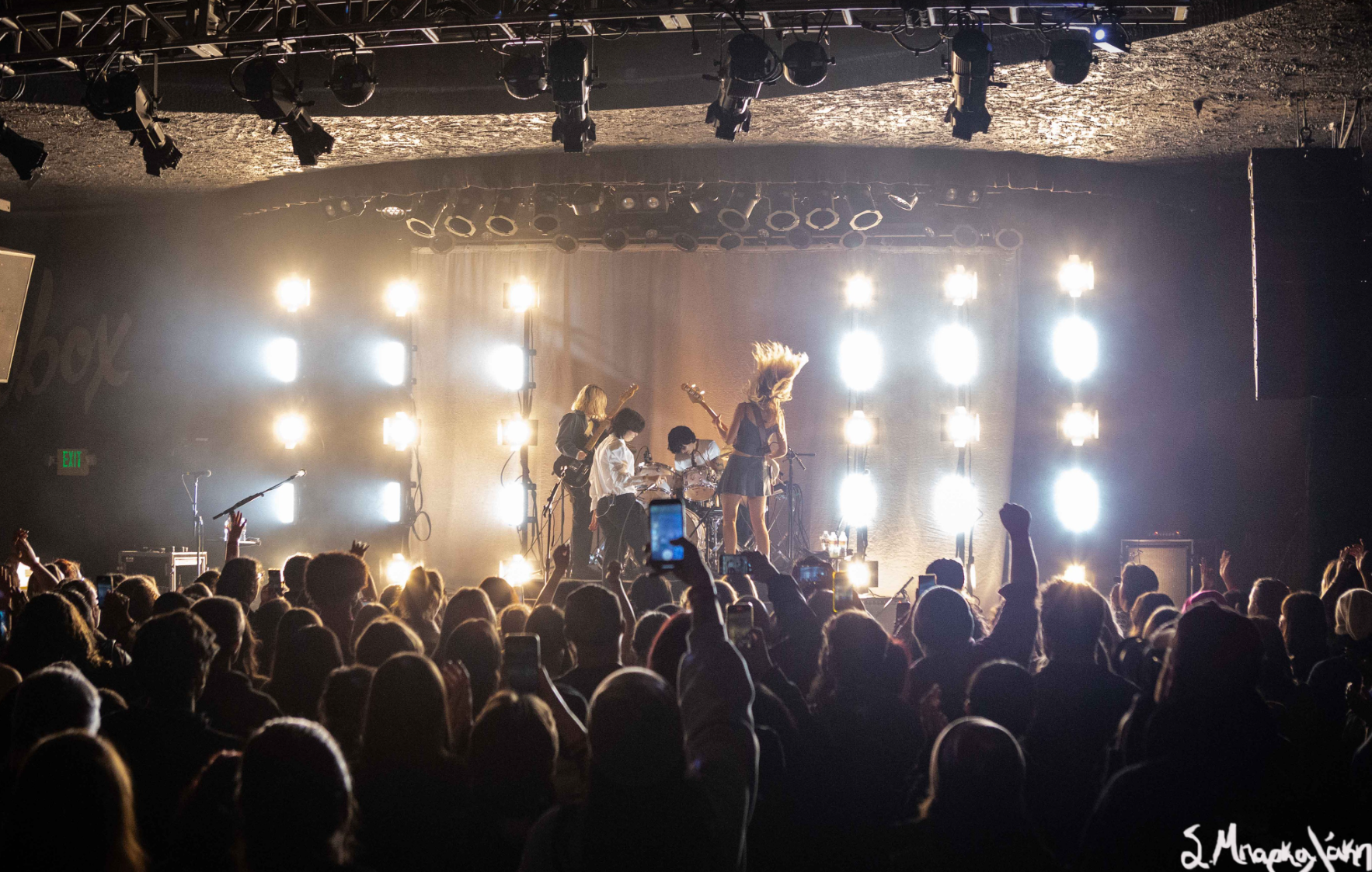 The Market was packed with joyous fans waiting for The Aces to come to the stage. Right before they walked in Paramore‘s “Misery Business” played, and the fans started to sing along waiting for them. This was quite a way to get everyone pumped up in the right way, so of course when they stepped on the floor, everyone was already screaming ready to go. Lead singer Cristal Ramirez grabbed the mic and starting with “Always Get This Way.” Cristal was wearing a black suit, black tie, and black sunglasses adding an extra cool factor to the band’s vibe. kicking off the night with. The rest of the band was moving back-and-forth full of energy ready entertain. The stage was set with checkered flooring and integrate lighting that constantly changed and amazed throughout the night.