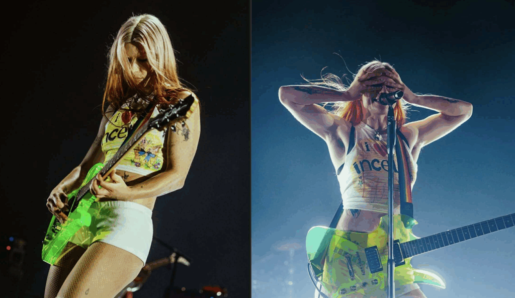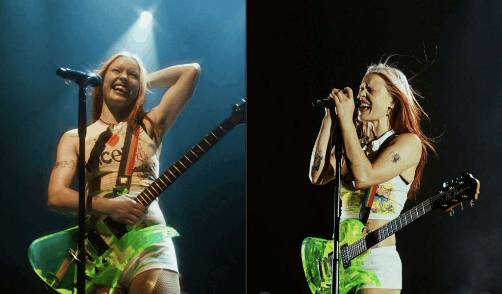 In terms of style, front woman Rhian has blossomed into her own courtesy of a queer awakening. Style: extending on Amy Taylor‘s emulation of feminine duality, Rhian adds her own off beat-broken-down-doll beautiful to the mix. She strikes a pose curling her biceps, hair blowing in the wind, holding a stern look with a stiff upper lip. We’re seeing more outward expression than I remember from her: reverse ombre, bleached brows, with a shirt I Love Incels doodled on. The stage itself was no frills, she herself is the frill.