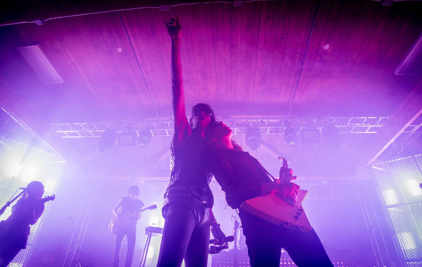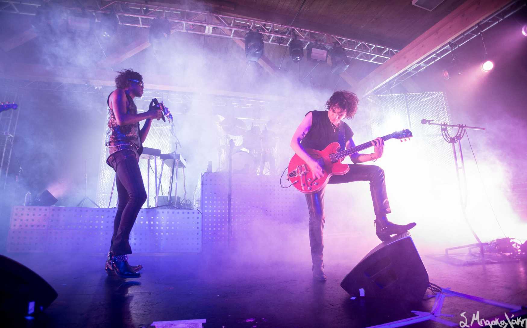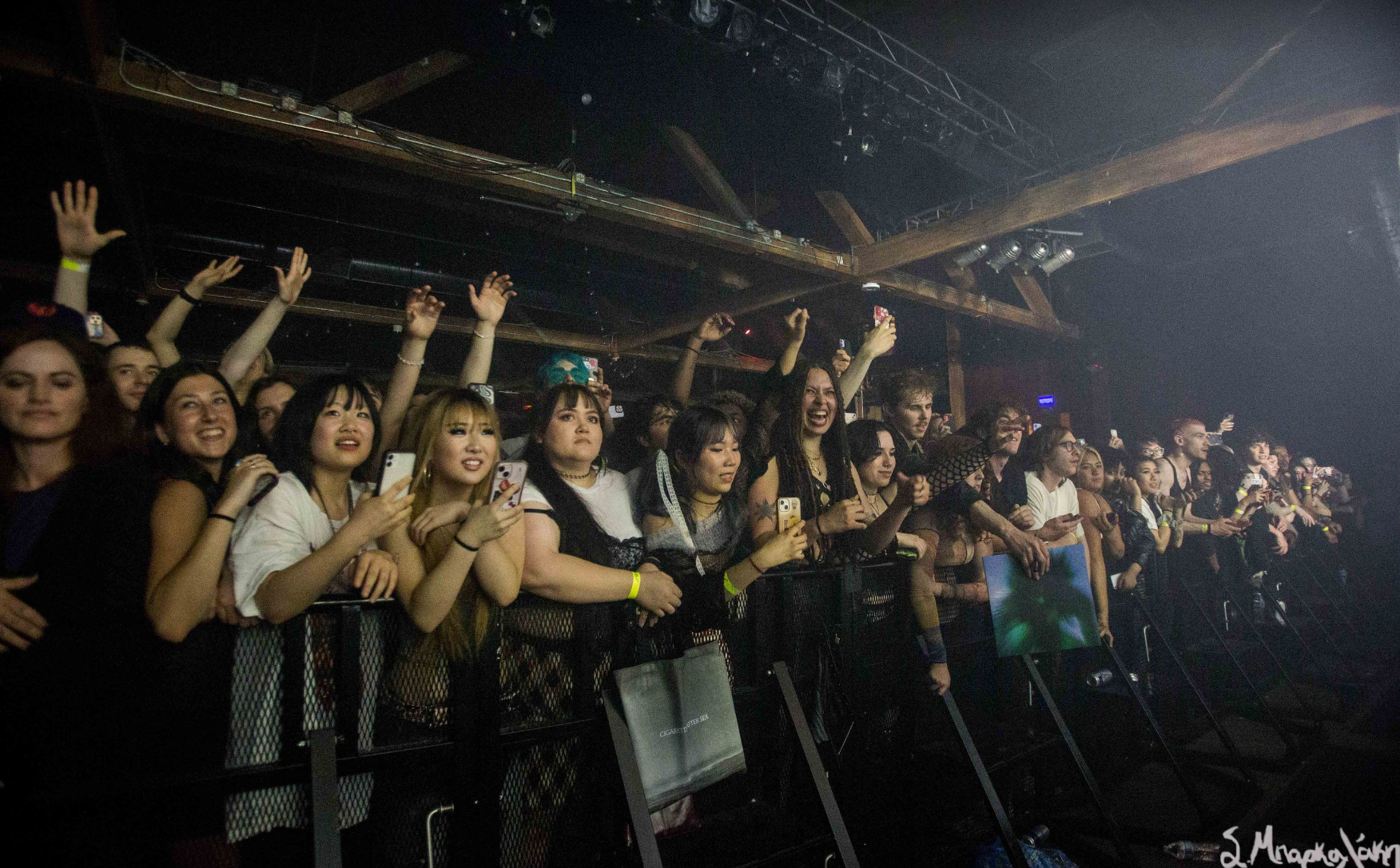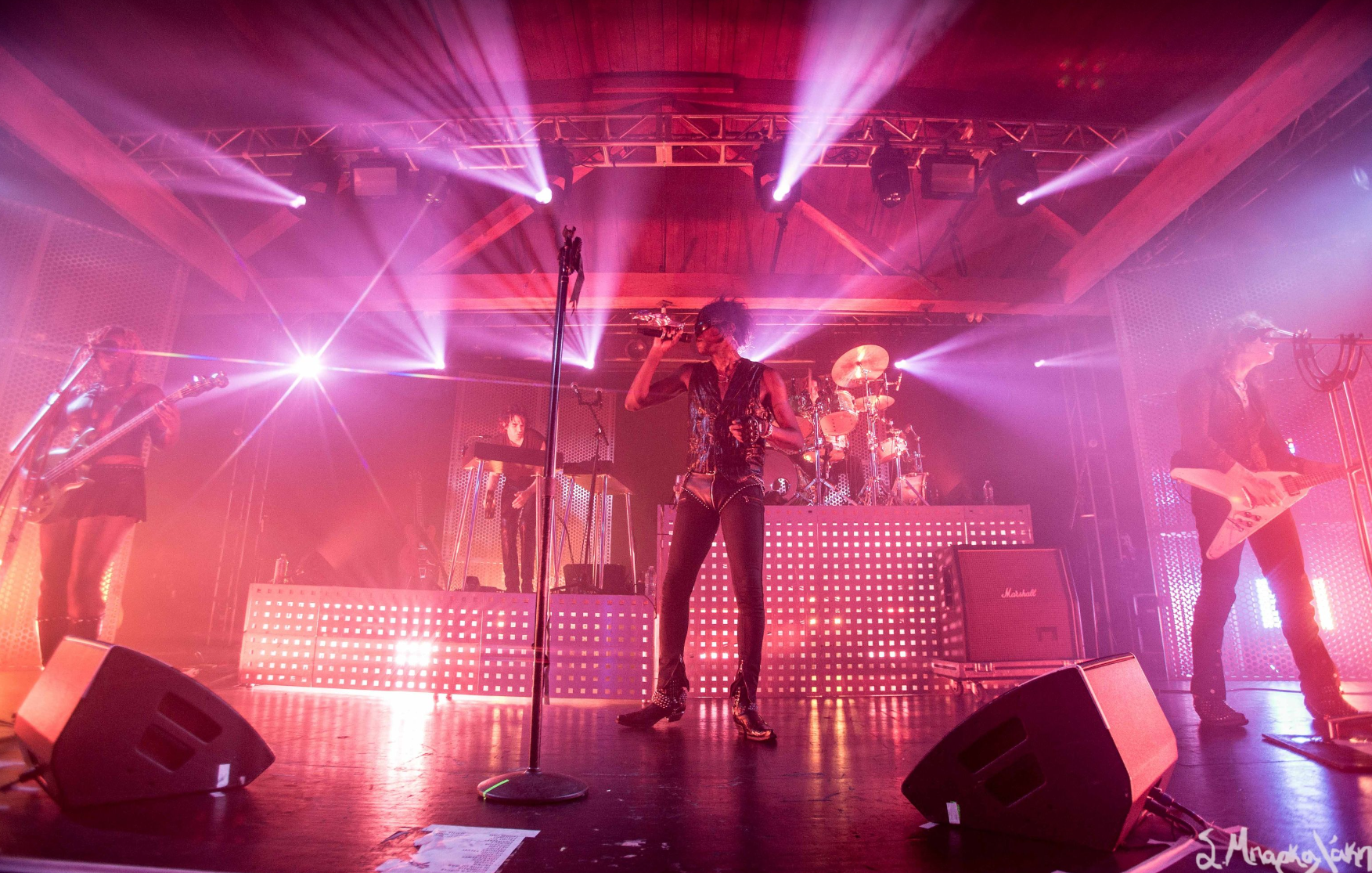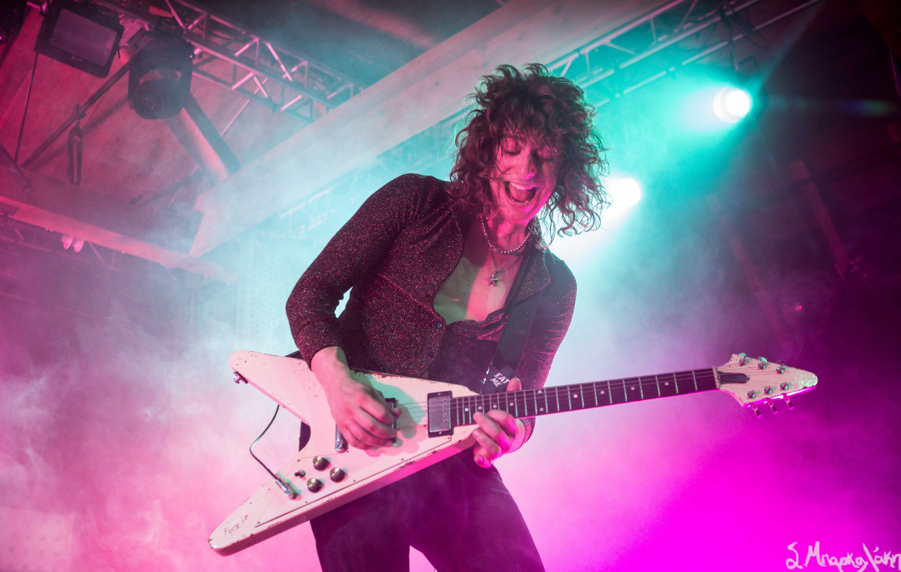 They kicked off with “God Is a Circle,” which they played twice as the sound was off the first. Then “Echolalia,” “In Spite of War,” and “Jackie.” The crowd went crazy right away singing along to every word and dancing their legs off. Tumor was wearing all black clothes with sunglasses, the back of their leather jacket reading, ‘Eat My F*ck.’ The very interesting I noticed was that their mic was decked out with a metal piece that looked like a dragon. New fad for artists?